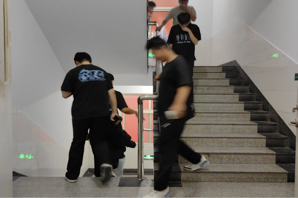 随着警报声响起,演练正式启动。各楼层疏散引导员立即按照既定分工到位,冷静指挥学生用湿毛巾捂住口鼻,采取弯腰、低头、靠墙的姿势,沿预先规划的安全路线快速、有序撤离。撤离过程中,同学们听从指挥、不推不挤,始终保持安全间距,提前于规定时间撤离至校园指定的安全集结点。疏散环节衔接顺畅、高效有序,充分展现了同学们扎实的应急知识和快速的反应能力。与此同时,消防救援车辆及人员第一时间入校,展开模拟火情侦察、搜救及扑救等救援环节,专业规范的处置流程为演练增添了实战色彩。