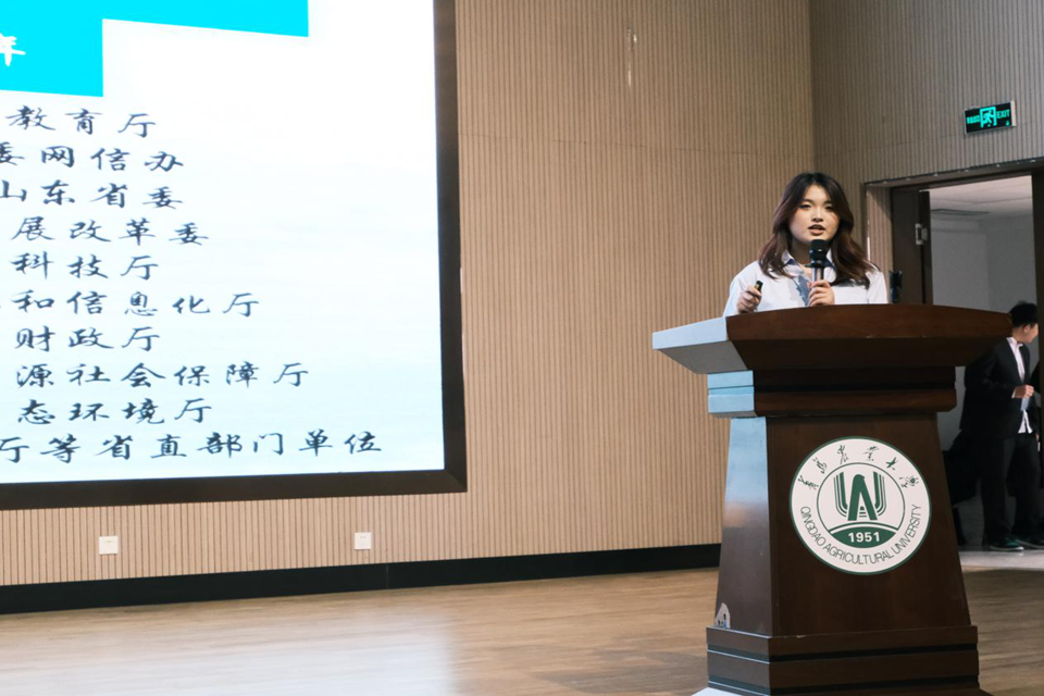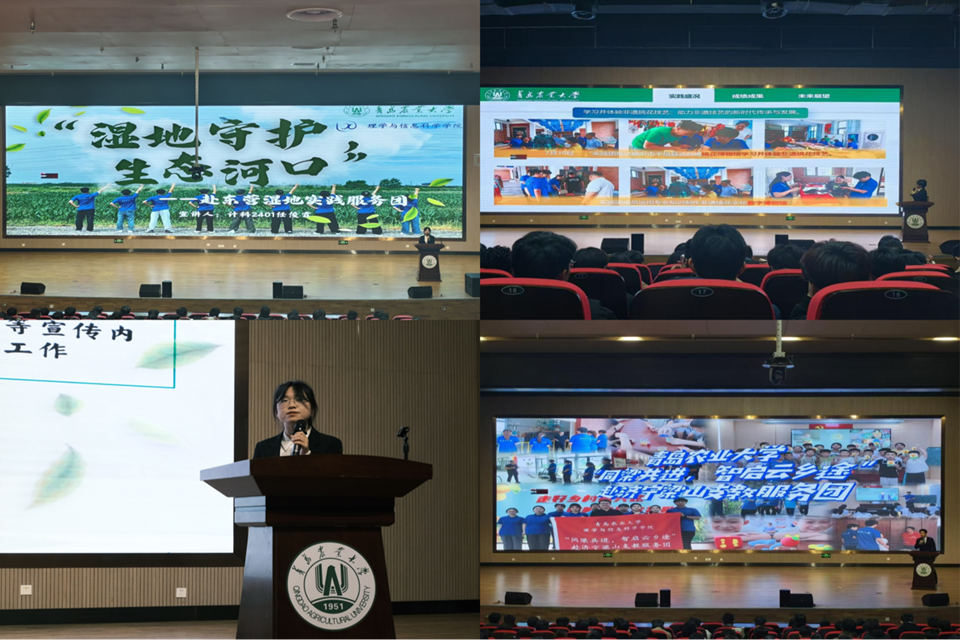 紧接着,在“青春践行担使命,志愿深耕润乡土”实践方面,计科2401班任俊霏、云计算2303班马光锦、计科2402班李甲豪三位实践代表分别分享了赴东营湿地实践服务团、赴临沂葡萄之乡实践服务团和赴济宁梁山支教服务团的实践经历。他们详细介绍了生态调研、科技传播、非遗传承和支教助学等实践内容与成果,阐述了农业赋能、红色传承的重要性,有效激发了同学们参与社会实践的热情与决心。
